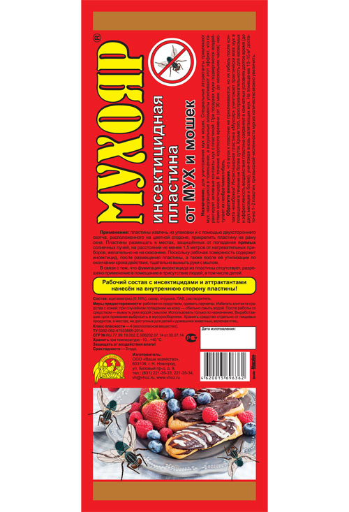 Обратите внимание, что мухи к пластине не приклеиваются, но их гибель после контакта неизбежна! Инсектицидная пластина «Мухояр» уничтожает практически всех мух в помещении в течение не более суток. Кроме того, свою привлекательность для насекомых и эффективность воздействия пластина сохраняет в комнатных условиях долгое время (до двух месяцев и более), уничтожая вновь залетающих мух. На помещение 10–15 м2 достаточно 1–2 пластин, при высокой численности мух их количество можно увеличить.