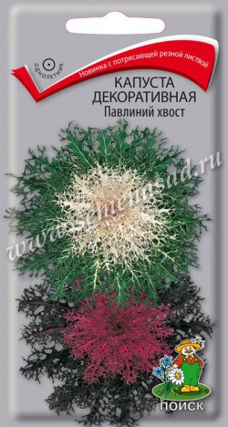 КАПУСТА декоративная Павлиний хвост Новинка с потрясающей резной листвой, напоминающей перья птицы. Растение высотой до 30 см. Листья резные, зелёные с белой серединой и тёмно-малиновые с розовой серединой. Используется для бордюров, посадок группами. Агротехника. Растение холодостойкое, легко переносит заморозки, предпочитает хорошо дренированные почвы и солнечные места. Размножают посевом семян в конце марта – начале апреля в рассадные ящики. Глубина заделки семян 0,5 см. При температуре почвы +20°C всходы появляются через 4-7 дней. Сеянцы пикируют в фазе 1-й пары настоящих листьев, в мае рассаду высаживают в открытый грунт. Расстояние между растениями при высадке 30-45 см.