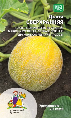 Сверхранний сорт, который созревает всего за 60-70 дней после появления всходов. Плетистое растение со средней длиной стебля. Листья зелёные, слабо рассечённые. Плоды округлые, жёлтые, гладкие, с плотной сеткой. Вес около 1,5-2 кг.